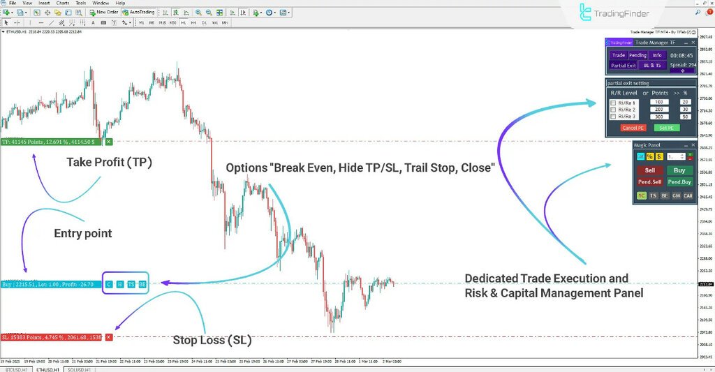 • Trade Manager TF Expert (TradingFinder): A comprehensive management dashboard that automates stop-loss, take-profit, and break-even logic. It’s one of TradingFinder’s most-used MT5 downloads, thanks to its simplicity and reliability;