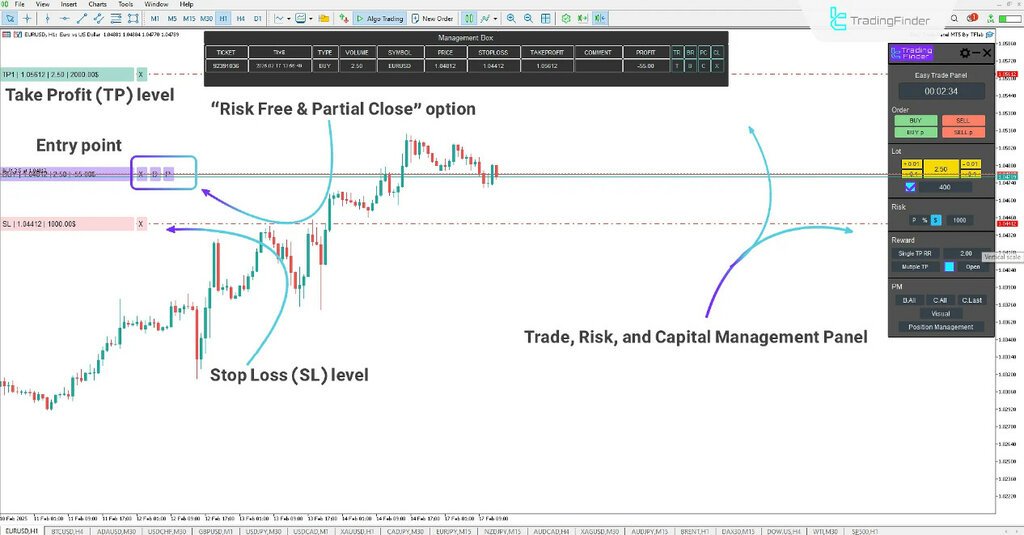 • Easy Trade Panel Expert (TradingFinder): This panel lets traders visually control multiple orders, manage partial exits, and instantly apply risk settings. It’s ideal for discretionary traders who prefer manual control with automated support;